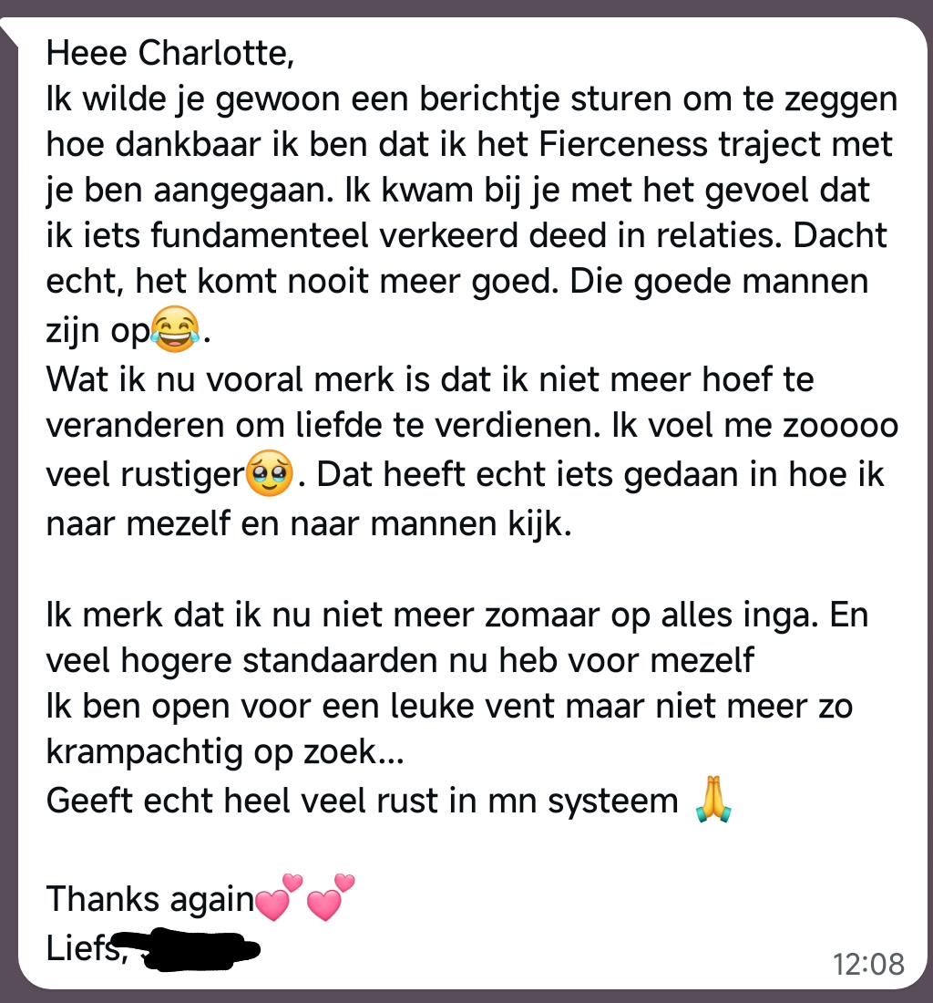 Ik help vrouwen om uit hun patroon van slechte relaties, continue grensoverschrijding en slachtofferschap te stappen en weer in hun eigen kracht te gaan staan. Als 8-jarig meisje maakte ik seksueel misbruik mee. Dus die onveiligheid voelen in mijn lijf, die ken ik wel. Maar we schrijven zelf ons verhaal. Mijn drijvende kracht is een seksueel veiligere wereld creëren en vrouwen weer thuisbrengen in hun veilige bedding en in contact met hun seksuele energie. Die bedding in mij kan jou dragen, in jouw proces. Ik geloof oprecht – en ik zie het bij al mijn klanten – dat je na een samenwerking nooit meer op zoek hoeft om die onrust in jezelf te fixen. Dus geen innerlijke reizen, familieopstellingen of heling meer om dan eindelijk eens goed genoeg te zijn voor een goede liefde. Want vrouw, je hebt veel meer regie dan je denkt.